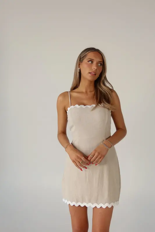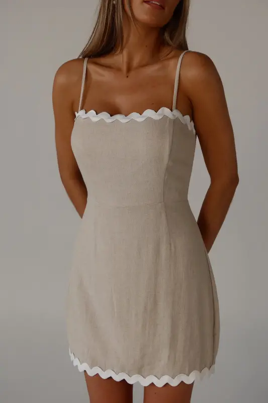 Our Marlee Scallop Trim Mini Dress features delicate ric rac trim detailing that adds a whimsical and unique accent to the classic mini dress silhouette. This too-cute dress that features thin adjustable straps, and a trendy square neckline. Crafted from high-quality fabric, this dress offers a comfortable and flattering fit, perfect for any occasion. The mini length showcases your legs, making it an ideal choice for warm weather and stylish outings. Hidden back zipper/clasp.