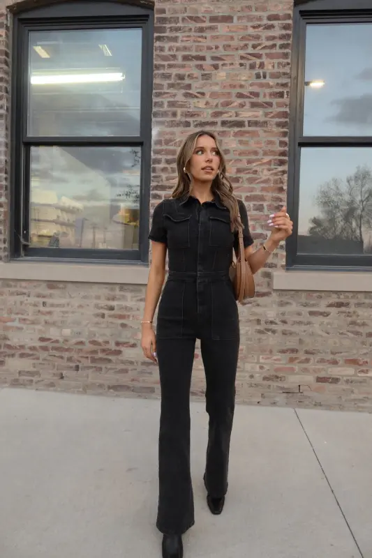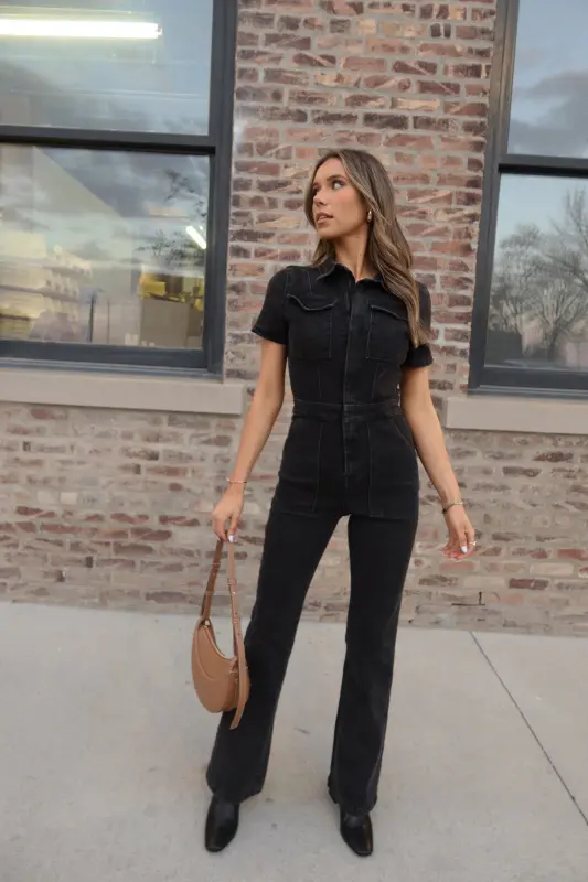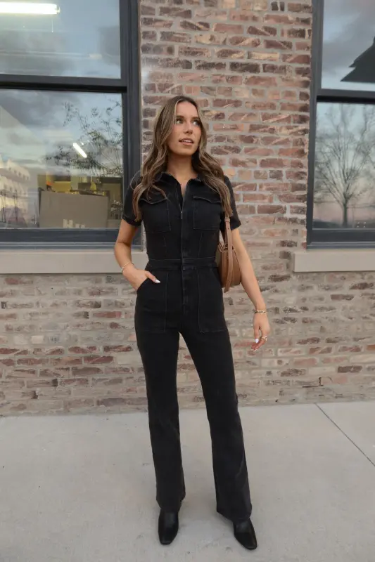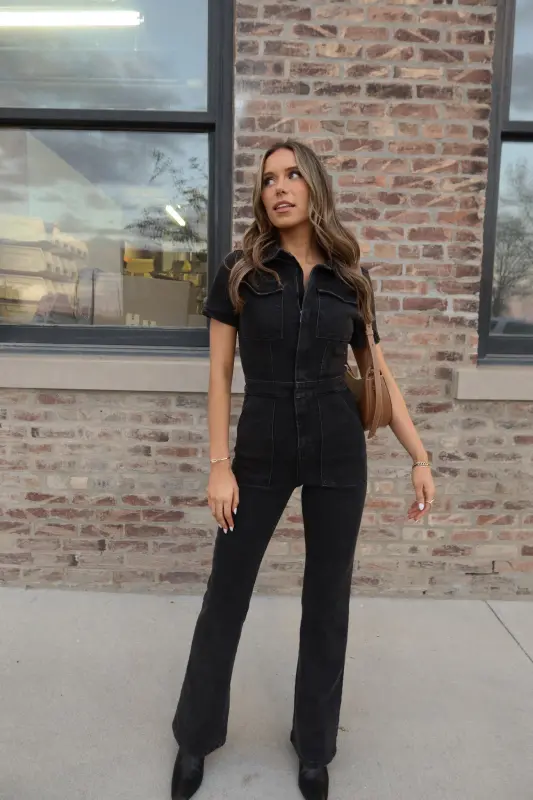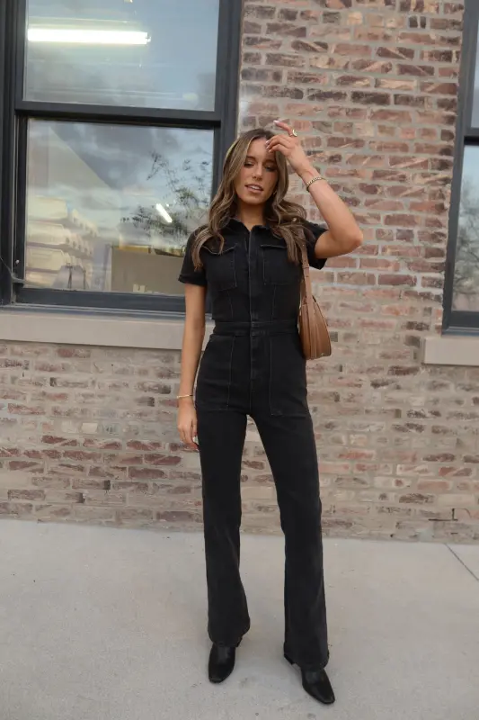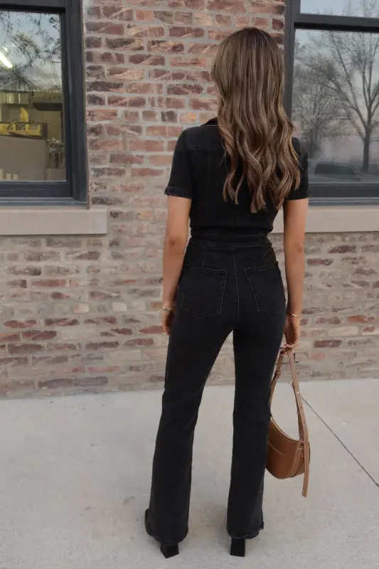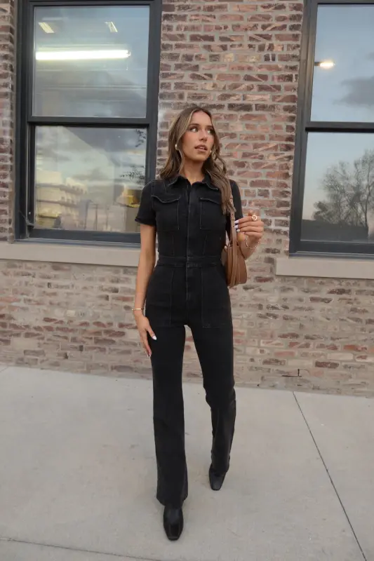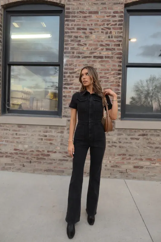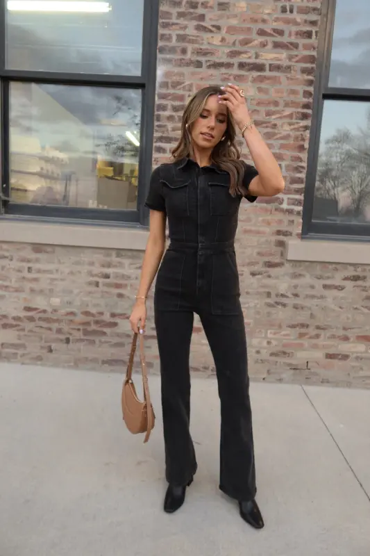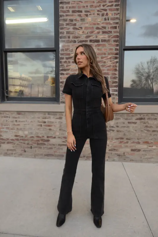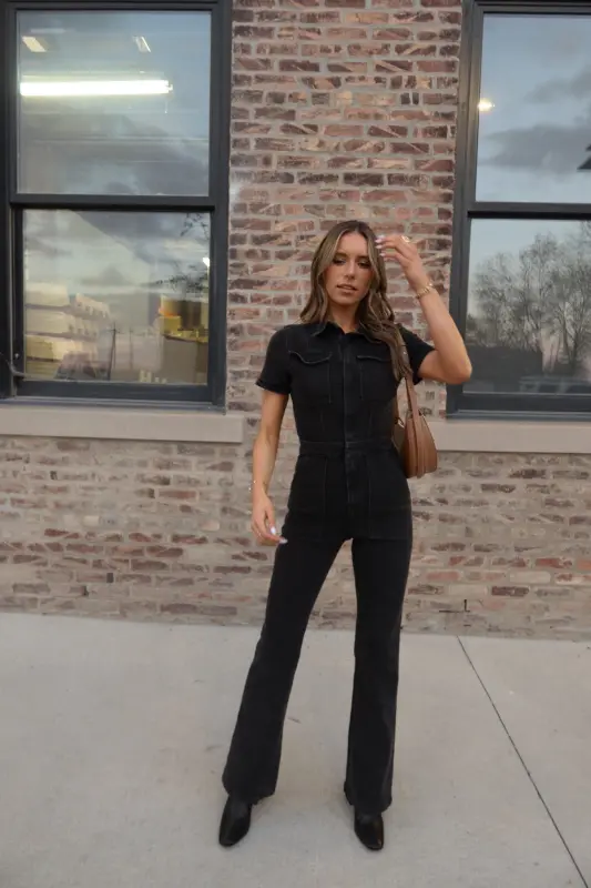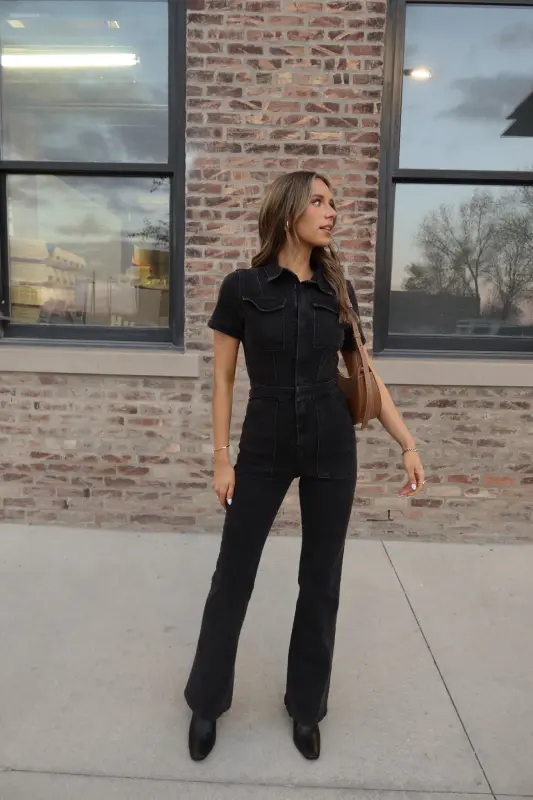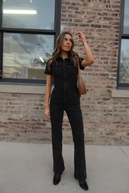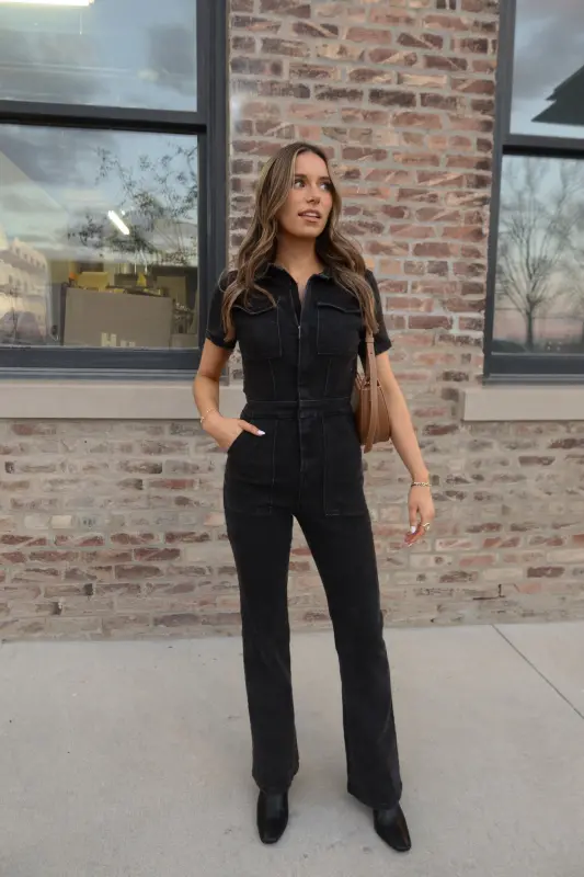 Our Chelsey Denim Jumpsuit is a black short sleeve denim jumpsuit with a collared neckline and zip closure down the bodice. This jumpsuit features a flare leg fit, cargo pocket detailing throughout, and emphasised waistline. This jumpsuit is completed functioning belt loops on the pronounced waistline, and two pockets on the bust. The back of this jumpsuit includes two back pockets. This jumpsuit has some stretch throughout and runs true to size.