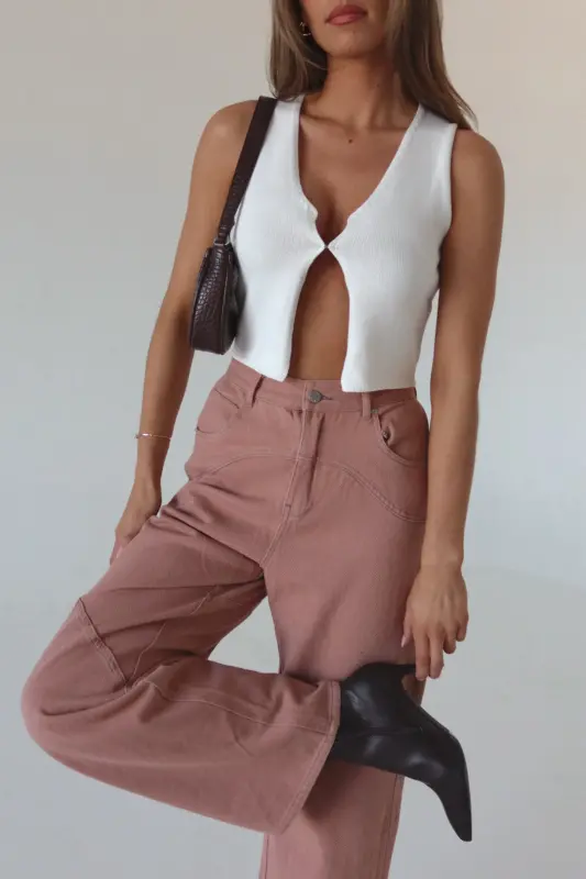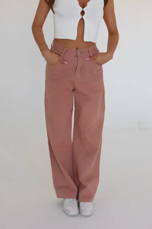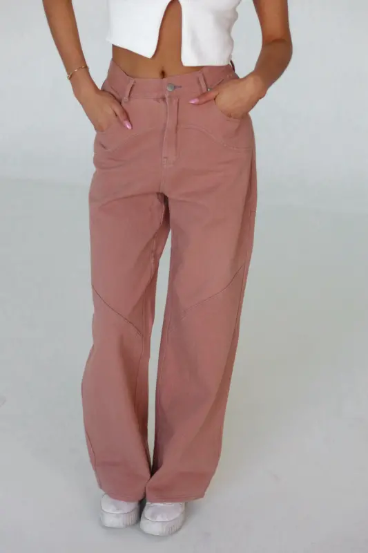 Discover our Terra Stitch Detail Wide Leg Pant, boasting a high-rise waist for a flattering fit. These stylish terracotta-colored pants feature a unique contrast stitch detail on both the front and back, adding a touch of sophistication to your ensemble. Complete with a button and zipper closure, as well as belt loops, these pants offer both style and functionality. Designed to fit true to size, they are crafted from structured denim, making them a wardrobe staple. For those in-between sizes, we recommend sizing up for the perfect fit.