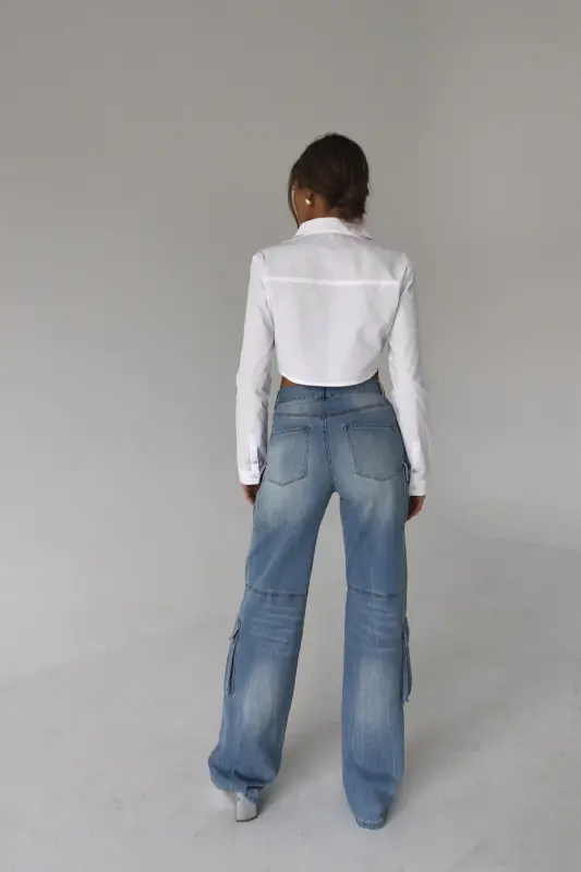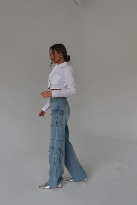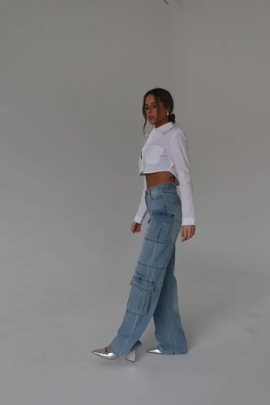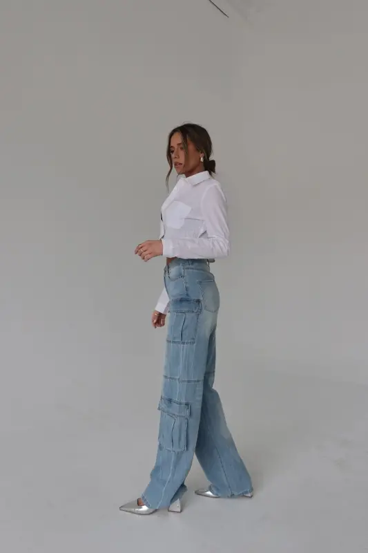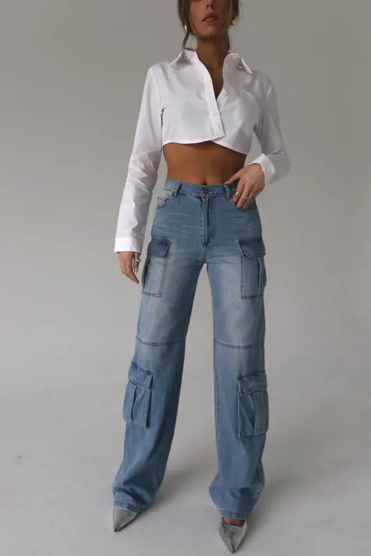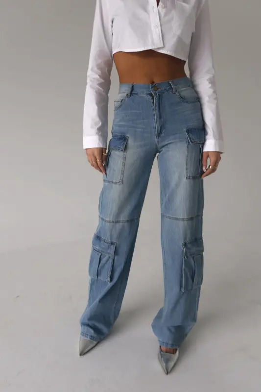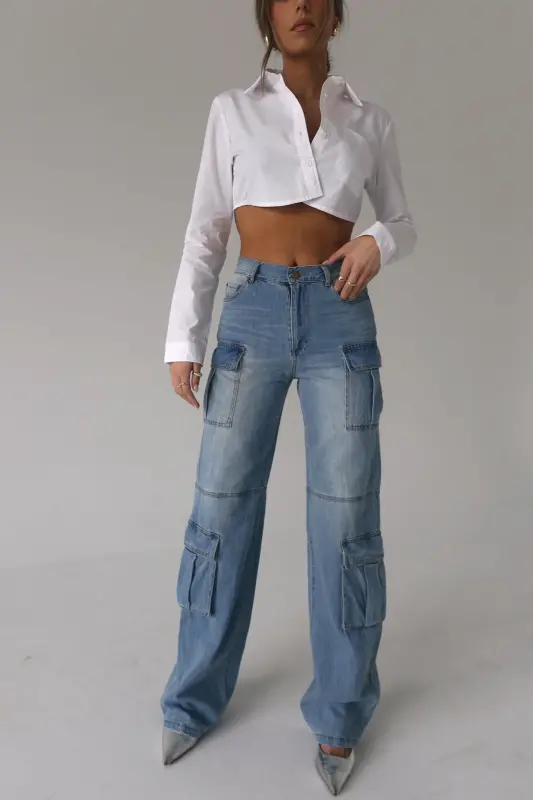 Our Trinity Denim Cargo Pants are a statement trendy jean you must have! These bottoms feature a straight silhouette. The pants feature multi cargo patch pockets, including cargo pockets below the knees. There is stitching details right above the knee. They have a button with a zipper closure on the front. There is little to no stretch in the fabric, so recommend sizing up if you are in between sizes.