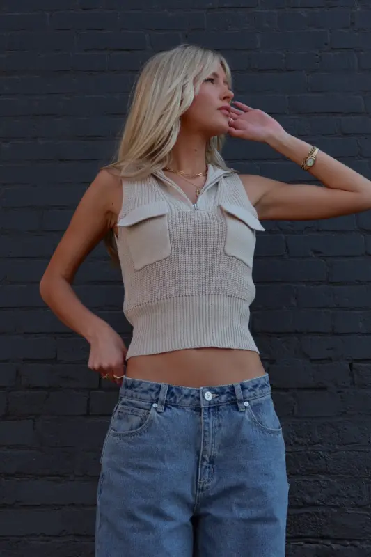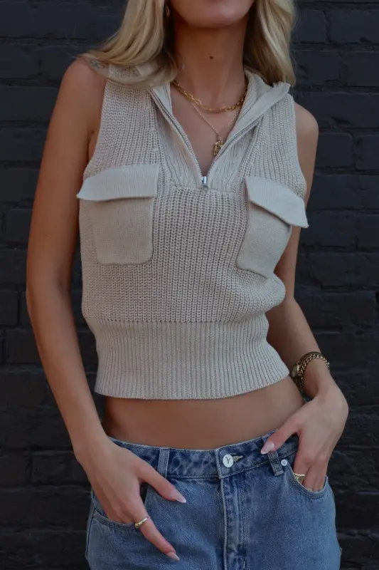 The Zippered Knit Sleeveless Top is a chic blend of comfort and style. Featuring a sleek zipper detail down the front and a structured collar, this top adds a modern twist to your wardrobe essentials. The sleeveless design keeps it effortlessly cool, while the functional pocket detail enhances its versatility and practicality. Whether you dress it up for a night out or wear it casually during the day, this knit top offers endless styling possibilities. Perfect for pairing with jeans, skirts, or trousers, it’s a must-have for any season.
